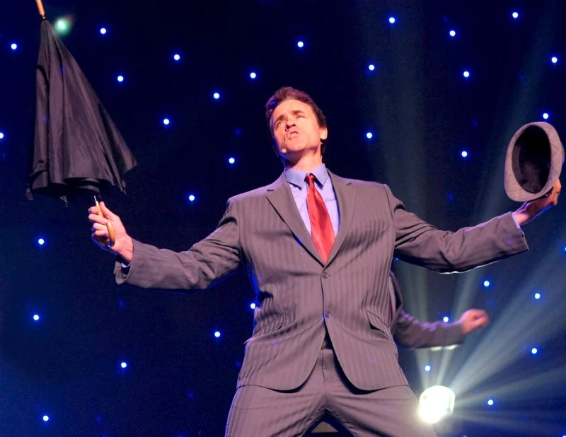 A single light flickers on as a handsome gent in a grey herringbone suit with a black umbrella moves into the light humming the tuneful beginning of Singing in the Rain.