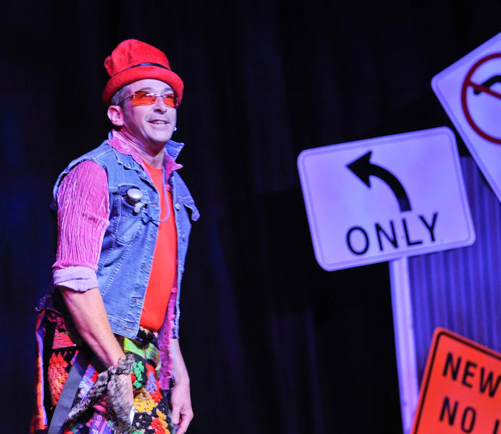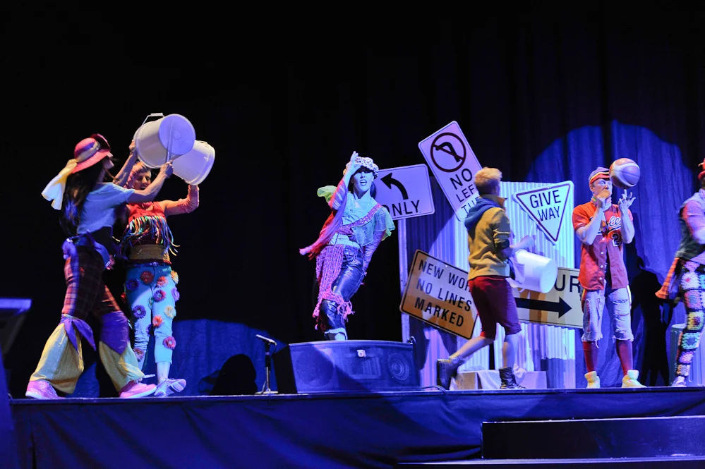 We are then introduced to our final energetic character who enters from the back of the room whistling to secure the audience attention. He belts out a short percussive riff and so begins a lively performance of call and response interplay, boisterous dance and fun. The troupe evolves to create complex rhythms on a wide range of unexpected props. The result is a high energy, totally unique performance bursting with colour and creativity.